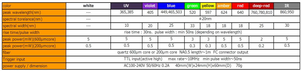 FOLS-10 is a palm top size pulsed LED source including MM output fiber, LED chip, driving circuit and power supply.