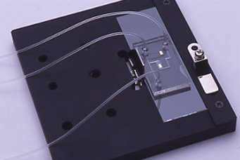 As the waveguide, a high refractive index glass waveguide with Au spotted is used. Au spot shape for bath measurement is different from that for flow path measurement. After attaching SAM of carboxyundecanethiol to the Au surface, fix the mouse IgG antibody and set the PDMS flow path as shown in the figure. (Fig.13)