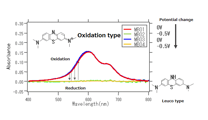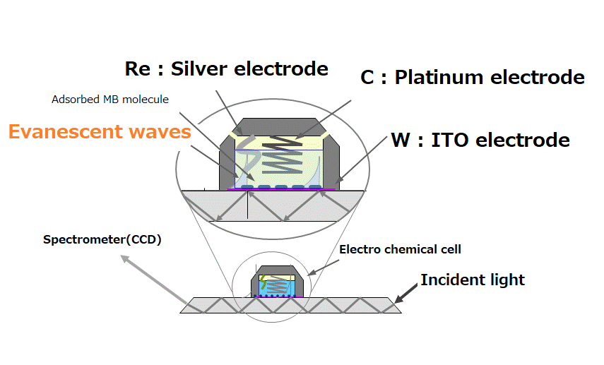 Simultaneous measurement with electrochemical measurement is one of the application fields to which optical waveguide spectroscopy is applied. Since the UV/Vis spectrum represents the electronic state of the molecule, it is convenient for visualizing the redox state of the molecule, and it has an advantage that the response from the spectrum that is not affected by the increase or decrease of the current value due to the scan rate of the electrochemical measurement can be obtained.